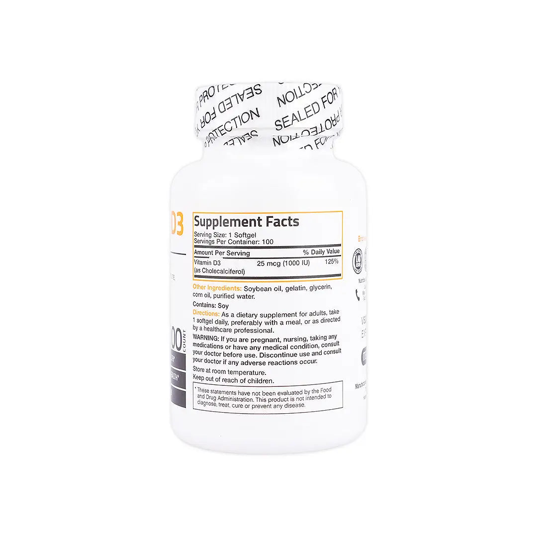 الفعّال: فيتامين د3 (كوليكالسيفيرول) ١٬٠٠٠ وحدة دولية. المكوّنات الأخرى (كبسولة رخوة): زيت فول الصويا، جيلاتين، غليسرين نباتي، زيت نباتي، ماء منقّى. يحتوي على صويا.