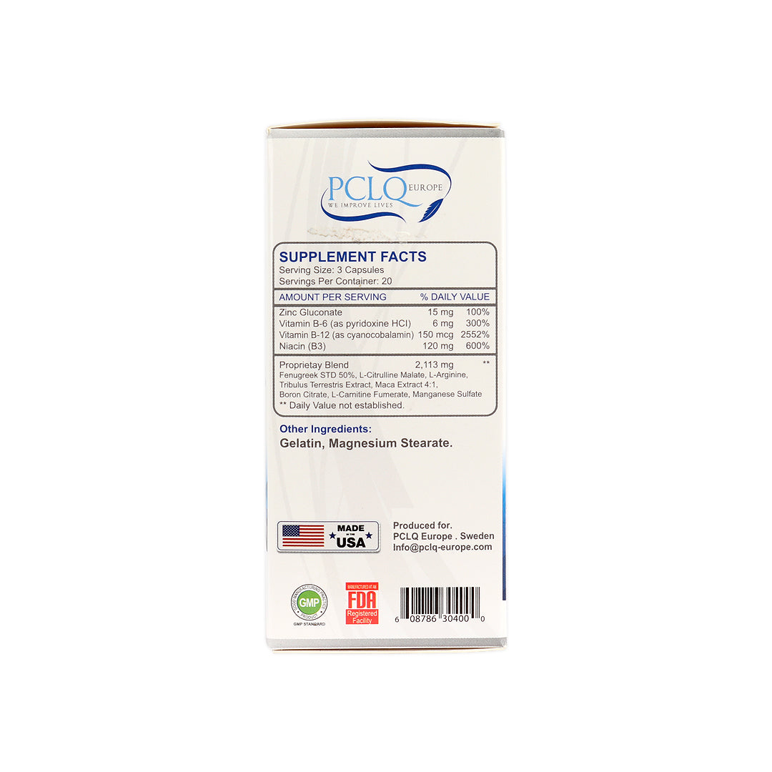 Maca Root Extract, Ginseng Extract, Tribulus Terrestris Extract, Zinc, Microcrystalline Cellulose, Magnesium Stearate, and other natural ingredients.