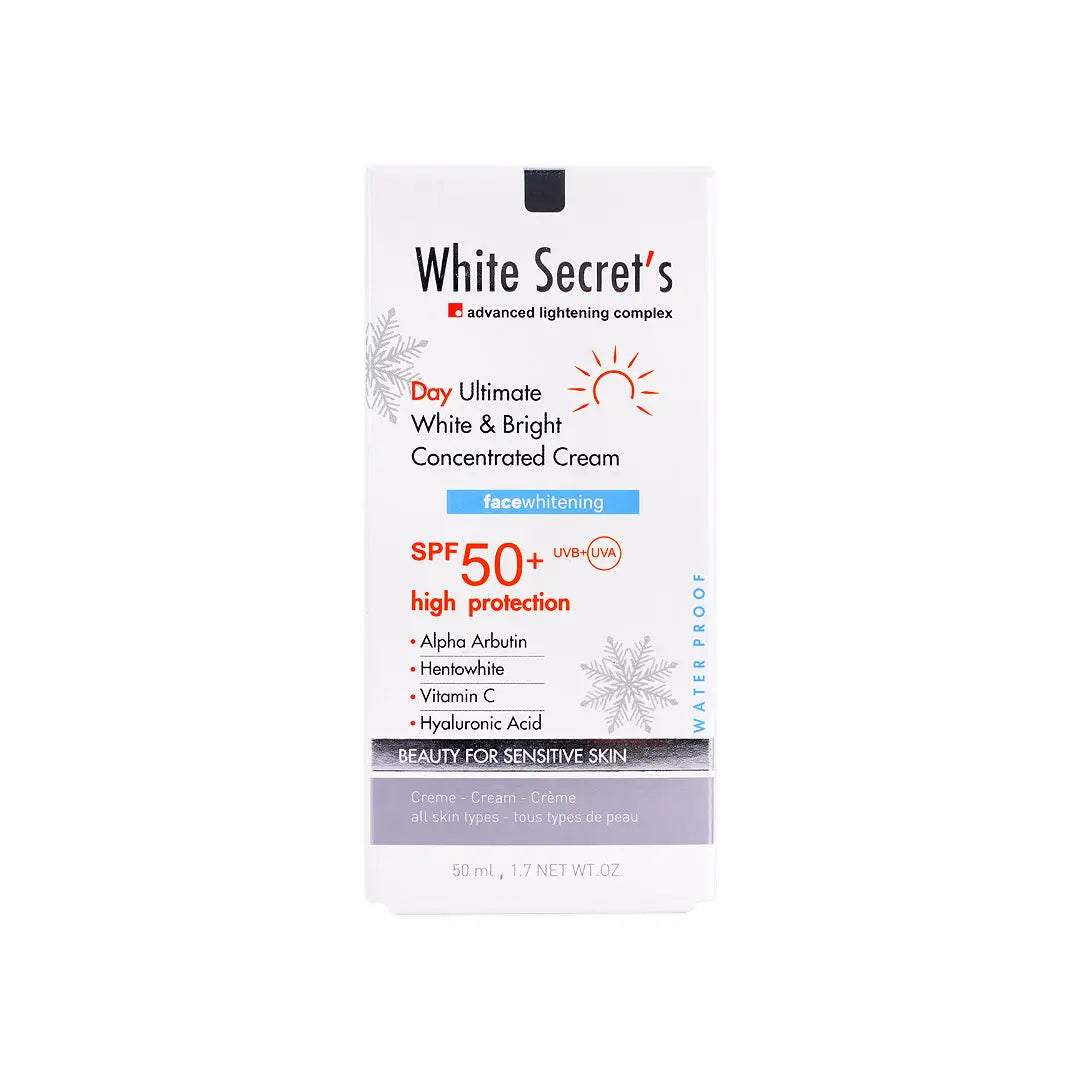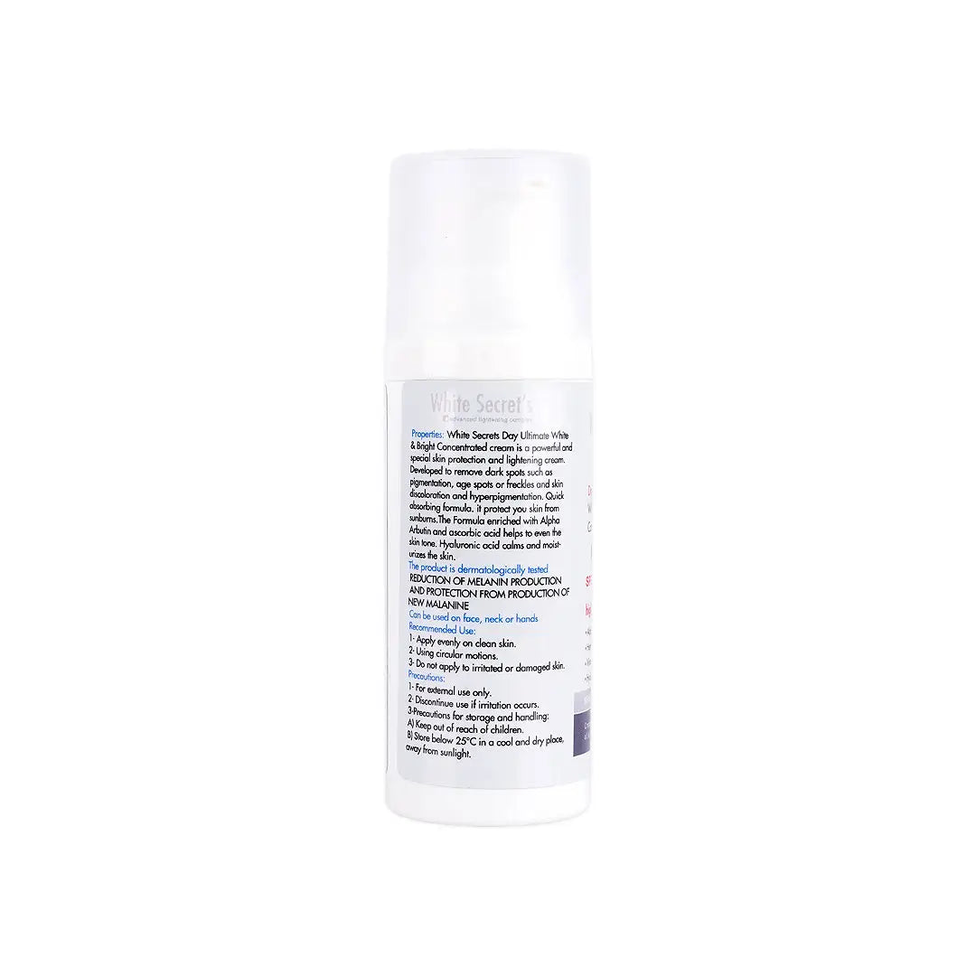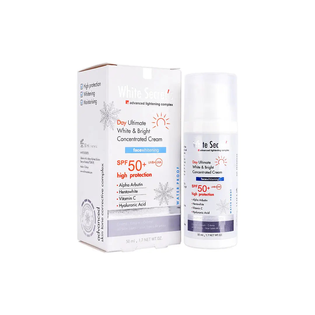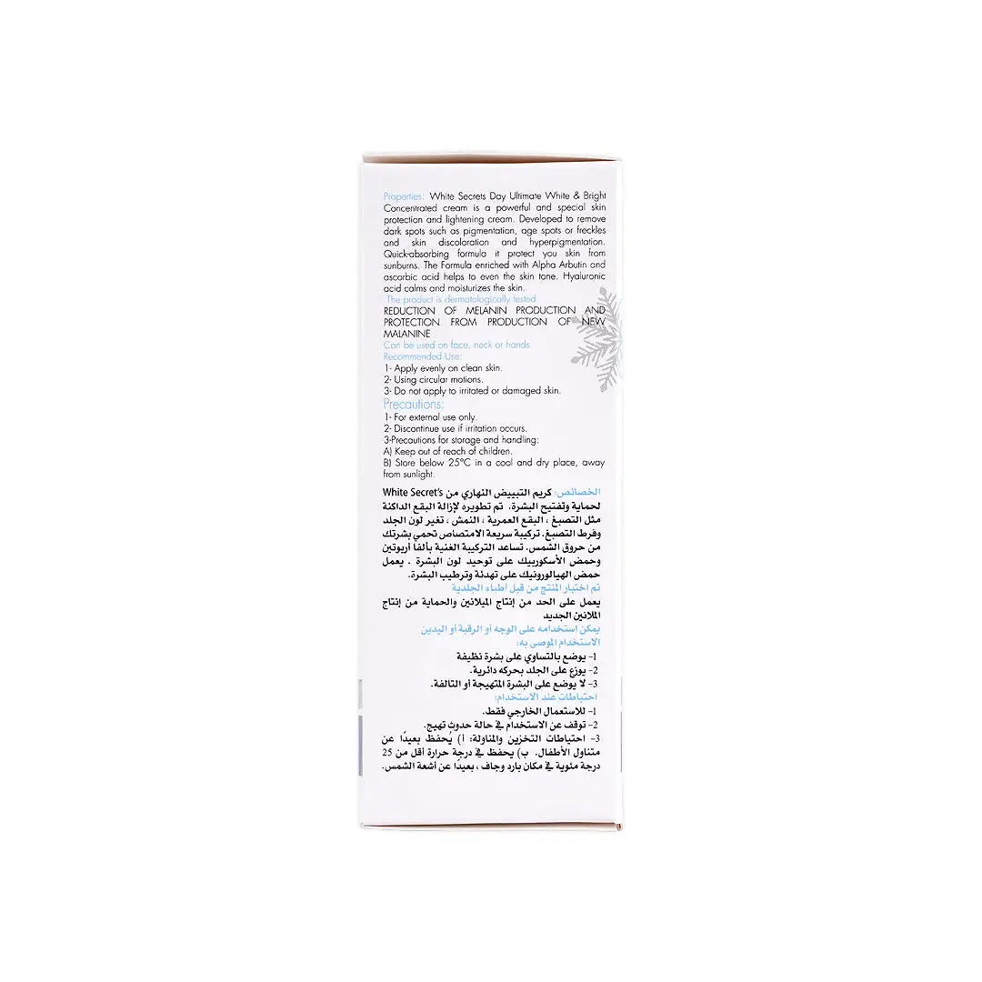 وايت سيكريتس التيميت كريم النهار لتفتيح البشره بعامل حمايه+50 المركز هو كريم قوي ومميز لحماية وتفتيح البشرة. تم تطويره لإزالة البقع الداكنة مثل التصبغ والبقع العمرية أو النمش وتغير لون الجلد وفرط التصبغ.