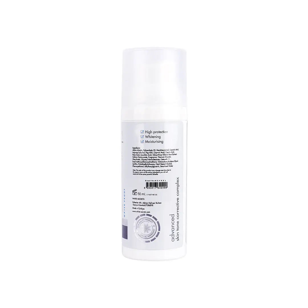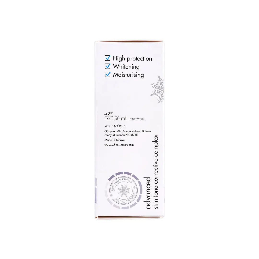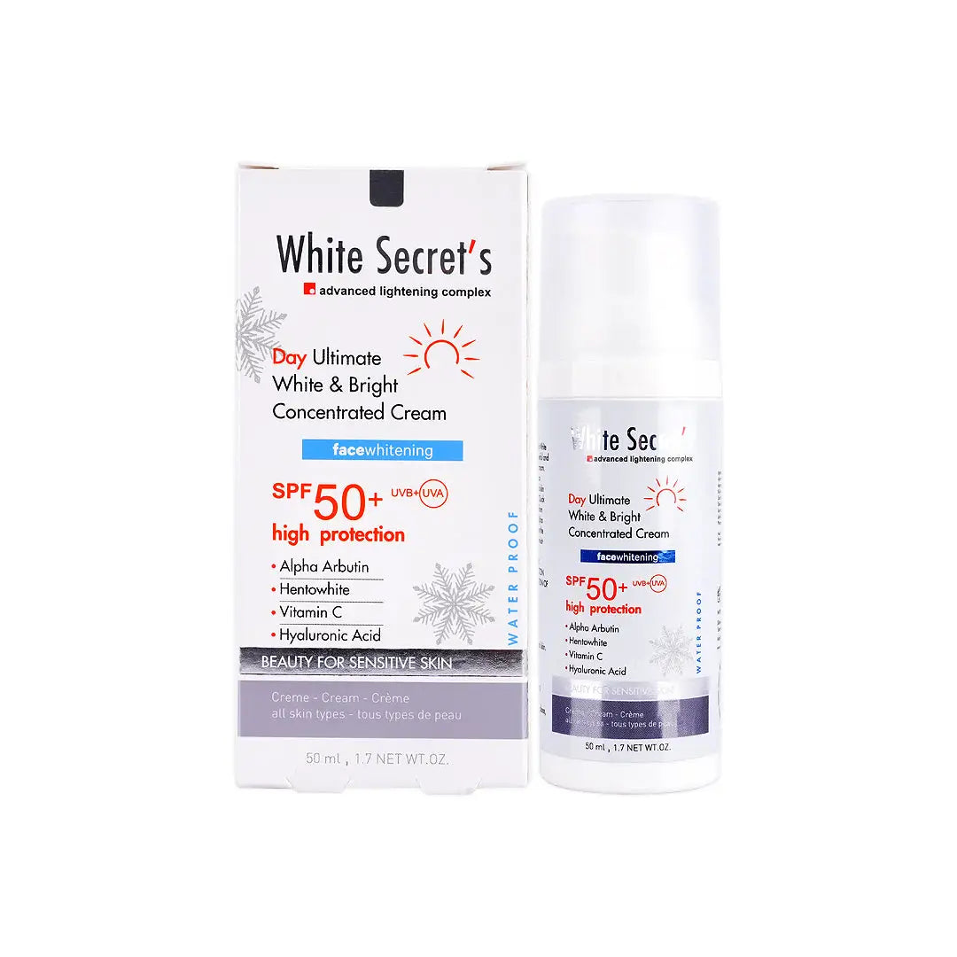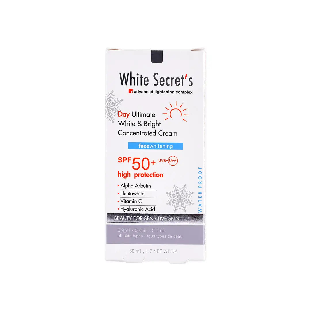 وايت سيكريتس التيميت كريم النهار لتفتيح البشره بعامل حمايه+50 المركز هو كريم قوي ومميز لحماية وتفتيح البشرة. تم تطويره لإزالة البقع الداكنة مثل التصبغ والبقع العمرية أو النمش وتغير لون الجلد وفرط التصبغ.