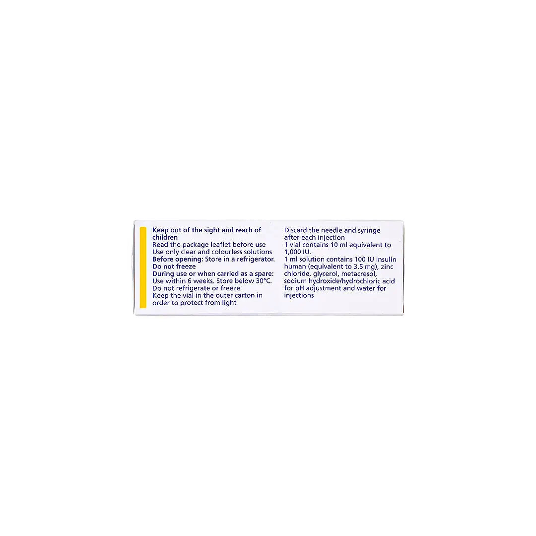 إنسولين بشري (ريغولار) 100 وحدة/مل. السواغات: كلوريد الزنك؛ غلسيرول؛ ميتاكرسول؛ هيدروكسيد الصوديوم (لتعديل pH)؛ حمض الهيدروكلوريك (لتعديل pH)؛ ماء للحقن.