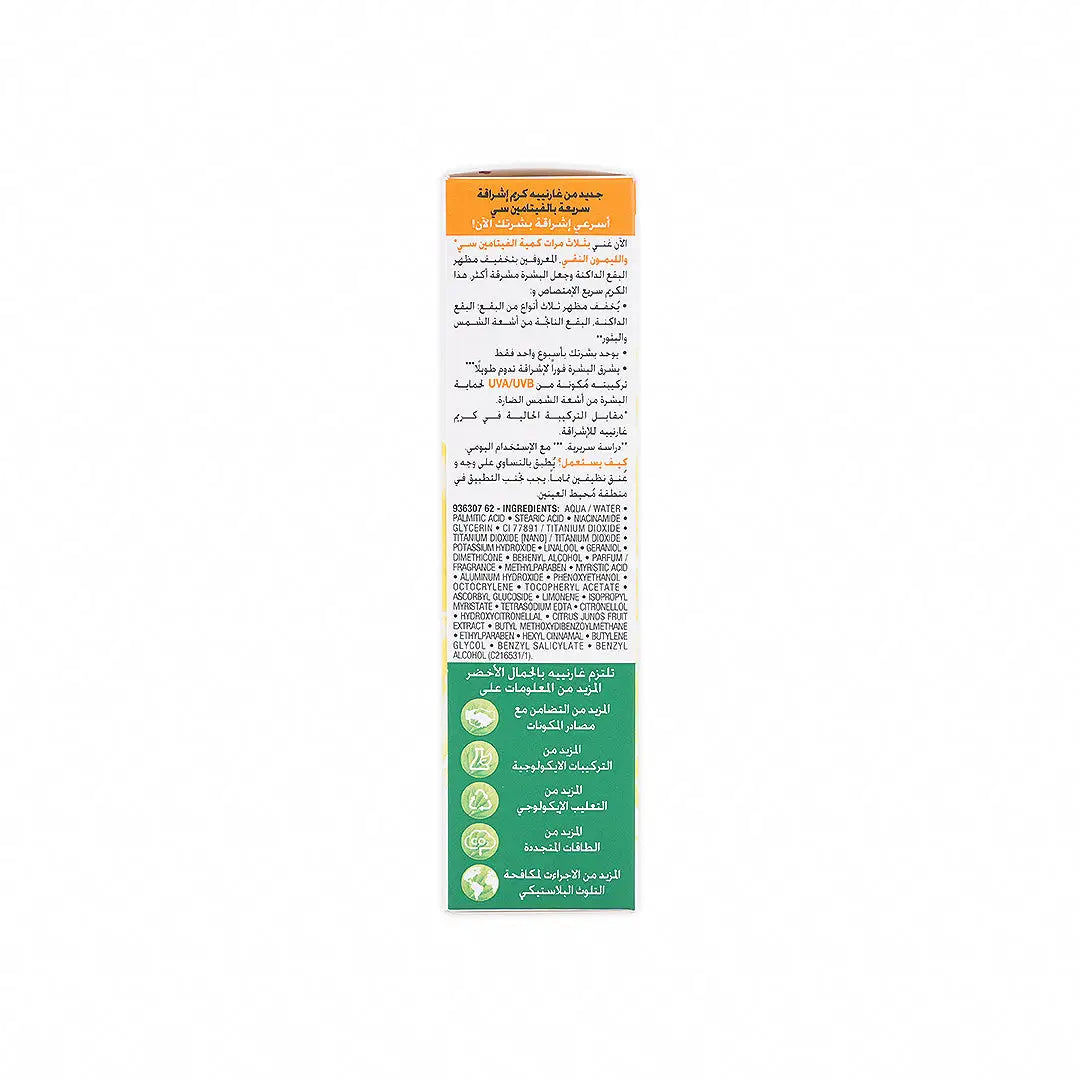 - فيتامين سي: يساعد مضاد الأكسدة القوي على تفتيح لون البشرة وتوحيده. يقلل من ظهور البقع الداكنة وتغير اللون مع تعزيز بشرة مشرقة. يساعد فيتامين سي أيضًا على حماية البشرة من الأضرار البيئية الناجمة عن الجذور الحرة.