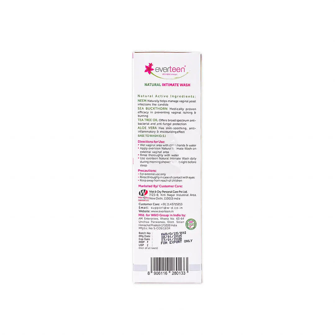 يحارب النيم عدوى الخميرة المهبلية العنيدة مثل المبيضات. نبق البحر يمنع الحكة والحرقان. يمنحك زيت شجرة الشاي درعًا قويًا ضد الهجمات البكتيرية والفطرية. الصبار يغذي ويهدئ ويشفي بشرتك ويمنع الالتهاب. يساعد الاستخدام اليومي لغسول المنطقة الحميمة الطبيعي إيفرتين على منع العدوى ويخفف من الحكة المستمرة أو الحرق في المناطق الخاصة. كما أنه يساعد في الحفاظ على توازن درجة الحموضة الطبيعية لتعزيز صحة النباتات المهبلية.