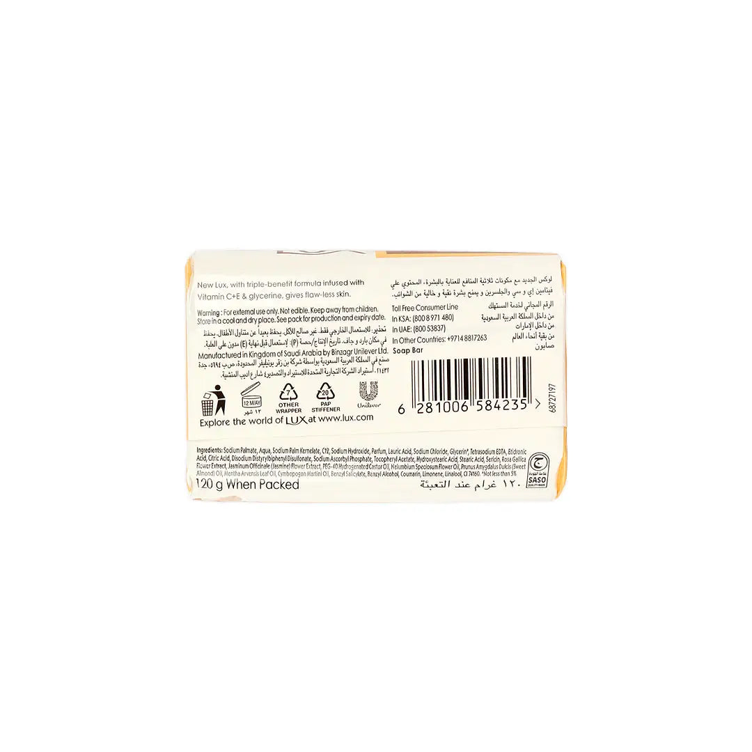 Sodium Palmate, Aqua, Sodium Palm Kernelate, C12, Sodium Hydroxide, Parfum, Lauric Acid, Sodium Chloride, Glycerin, Tetrasodium EDTA, Etidronic Acid, Citric Acid, Disodium Distyrylbiphenyl Disulfonate, Sodium Ascorbyl Phosphate, Tocopheryl Acetate, Hydroxystearic Acid, Stearic Acid, Sericin, Rosa Gallica Flower Extract, Jasminum Officinale (Jasmine) Flower Extract, PEG-40 Hydrogenated Castor Oil, Nemulbium Speciosum Flower Oil, Prunus Amygdalus Duclis (Sweet Almond) Oil, Mentha Arvensis Leaf Oil, Cymbopogon Martini Oil, Benzyl Salicylate, Benzyl Alcohol, Coumarin, Limonene, Linalool, CI 74160.