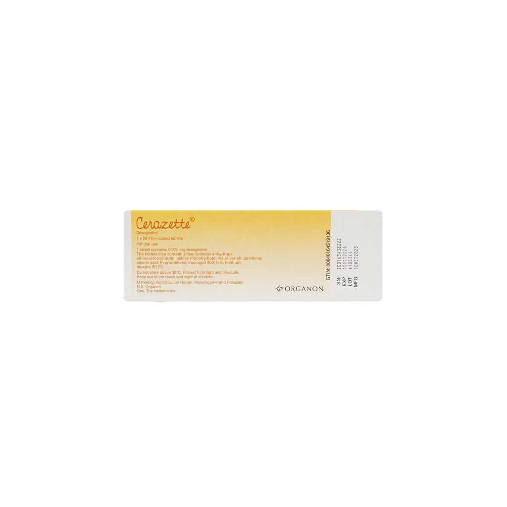 Desogestrel (0.075 mg), Lactose monohydrate, Povidone, All-rac-alpha-tocopherol, Stearic acid, Silica (colloidal anhydrous), Hypromellose,