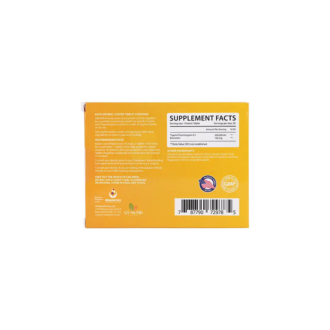 Trypsin/Chymotrypsin 6:1, Solutab (Crosscarmellose Sodium), Silicone Dioxide, Stearic Acid, Dicalcium Phosphate Dihydrate, Avicel (Microcrystalline Cellulose), and Magnesium Stearate (Vegetable Grade).