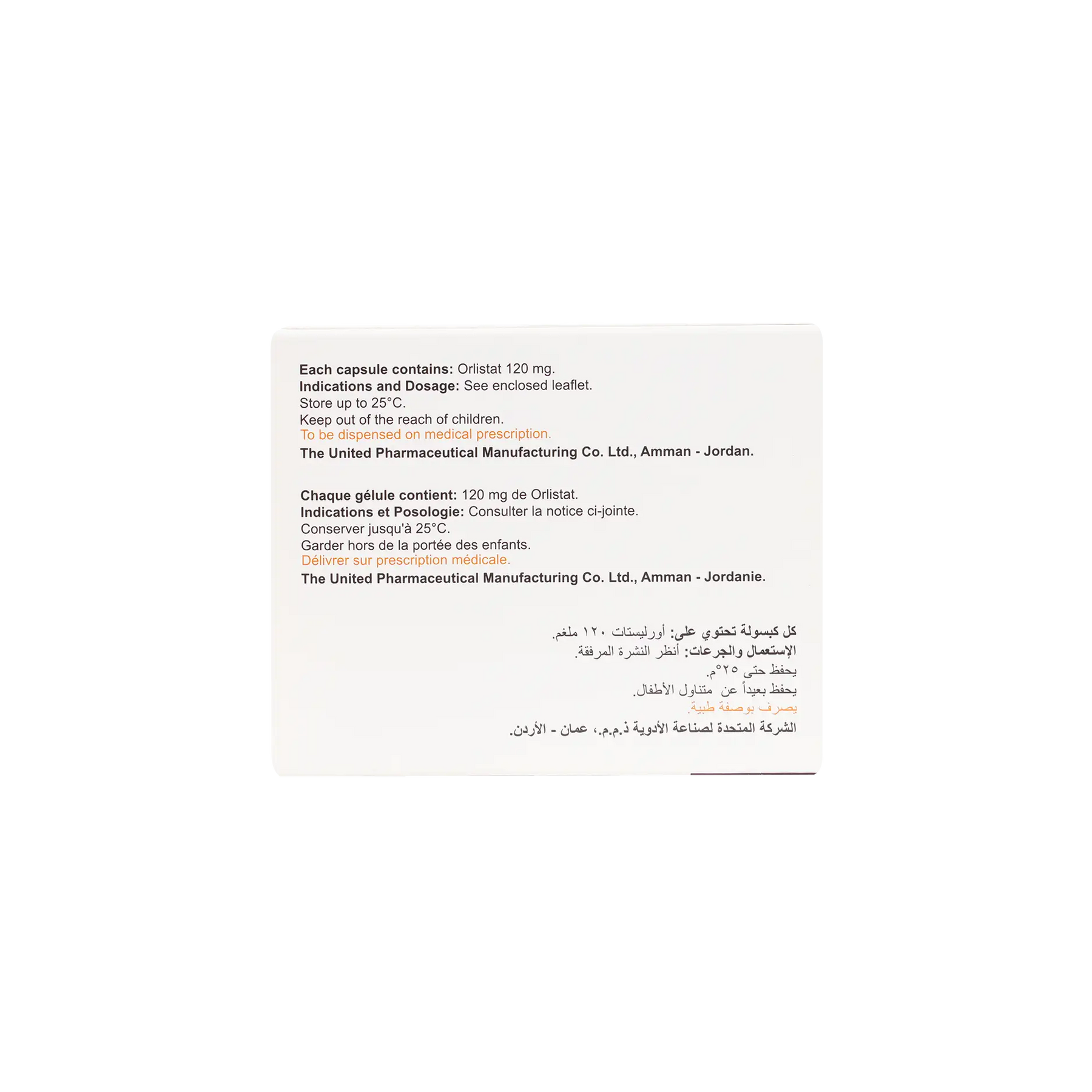 • أورليستات (120 ملغ): مادة فعالة تمنع إنزيم الليباز، مما يمنع هضم وامتصاص الدهون من النظام الغذائي، وبالتالي يساعد في فقدان الوزن.