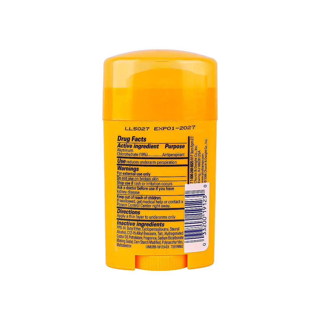 Aluminum Zirconium Tetrachlorohydrex GLY, Cyclopentasiloxane, Stearyl Alcohol, C12‑15 Alkyl Benzoate, Talc, Hydrogenated Castor Oil, Petrolatum, Fragrance, Sodium Bicarbonate (Baking Soda), Corn Starch Modified, Polysaccharides, Maltodextrin, PPG‑14 Butyl Ether.
