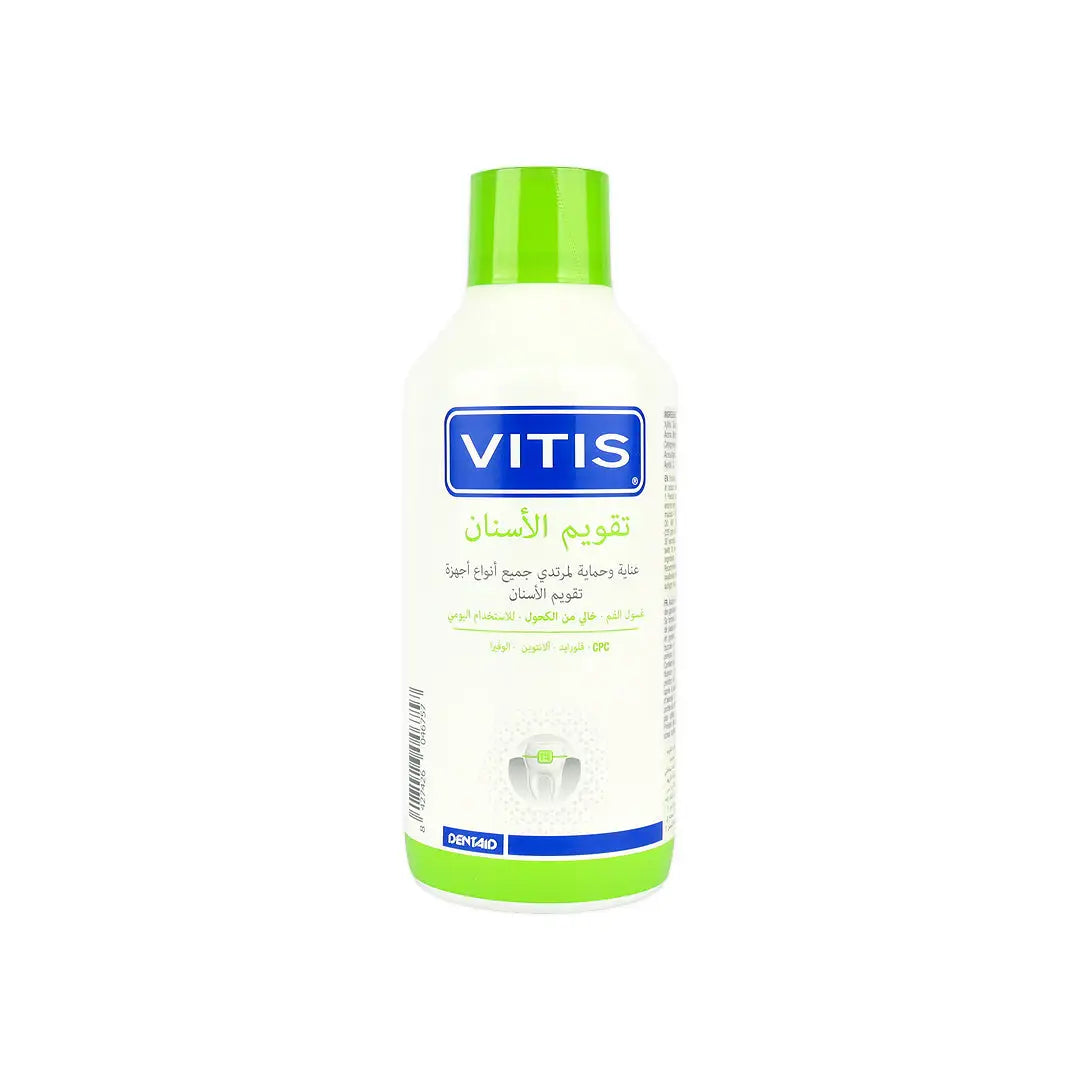 Indications For UseThe VITIS Orthodontic Mouthwash can be used daily to maintain a healthy mouth.Recommended for orthodontic appliance wearers.It can also be used by people who are prone to canker sores, sores and wounds.Suitable for patients with celiac disease.Apple mint flavour & alcohol free.Product CharacteristicsCetylpyridinium Chloride (CPC)A broad spectrum oral anti-septic with bactericidal and bacteriostatic effects.Reduces dental bio-film formation by eliminating bacteria 1Active against pro-inflammatory toxins released by bacteria, thereby preventing gingivitis.Fluoride (226 ppm)Prevents caries by increasing enamels resistance to demineralisation and by increasing remineralisation of initial lesions.Reduces acid production and prevents decrease in pH.Anti-bacterial effect reduces oral bio-film.AllantoinStimulates cell proliferation, helping to produce rapid tissue regeneration of damaged tissues.Protects and exerts an anti-irritant effect on oral mucosa.Aloe VeraPromotes healthy gums and healing of small lesions 2Anti-inflammatory with hydrating properties.