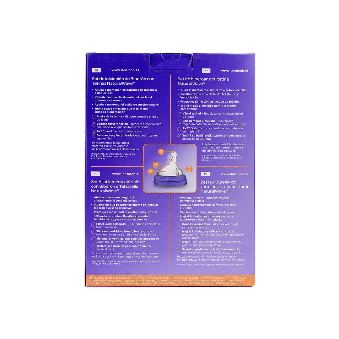 Starter set of Lansinoh feeding bottles with NaturalWave® silicone nipples (assorted flow levels) designed to support established breastfeeding while making expressed-milk feeds easy.
