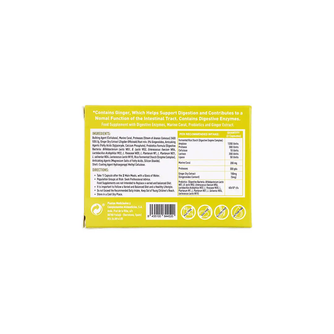 Vegetarian digestive support capsules formulated with plant extracts and digestive aids to ease post-meal heaviness and promote digestive comfort.