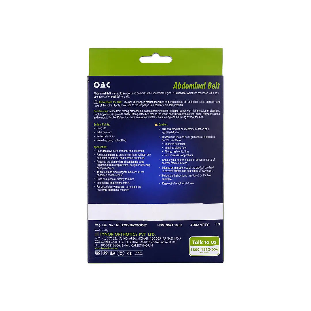 Abdominal Belt is used to support and compress the abdominal region. It is used for waist line reduction, as a post operative aid or post delivery aid.Long lifeExtra comfortPerfect elasticityNo rolling over, no bucklingMeasure circumference around the waist immediately below the navel.