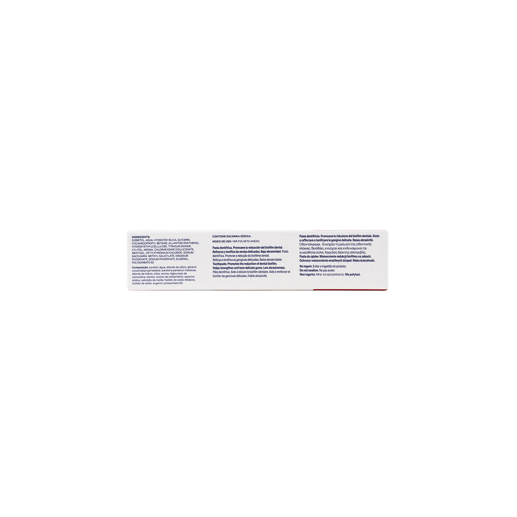 Aqua, Chlorhexidine, Fluoride, Glycerin, Sorbitol, Propylene Glycol, Xylitol, Aroma, Sodium Saccharin, Methylparaben, Propylparaben, CI 77891.