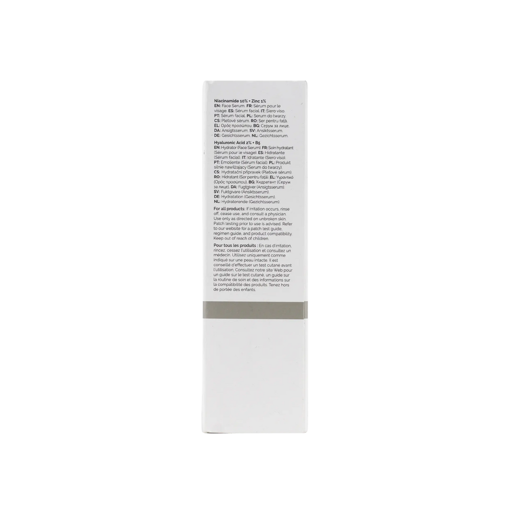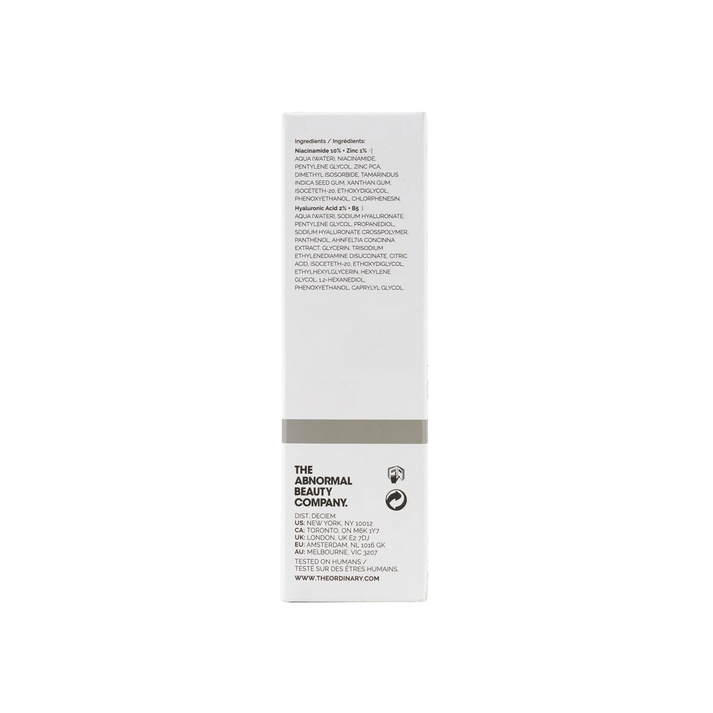 -Hyaluronic Acid 2% + B5 Full Ingredients List:: Aqua (Water), Sodium Hyaluronate, Pentylene Glycol, Propanediol, Sodium Hyaluronate Crosspolymer, Panthenol, Ahnfeltia Concinna Extract, Glycerin, Trisodium Ethylenediamine Disuccinate, Citric Acid, Isoceteth-20, Ethoxydiglycol, Ethylhexylglycerin, Hexylene Glycol, 1,2-Hexanediol, Phenoxyethanol, Caprylyl Glycol. -Niacinamide 10% + Zinc 1% Full Ingredients List:: Aqua (Water), Niacinamide, Pentylene Glycol, Zinc PCA, Dimethyl Isosorbide, Tamarindus Indica Seed Gum, Xanthan Gum, Isoceteth-20, Ethoxydiglycol, Phenoxyethanol, Chlorphenesin. Our Formulations Are Updated From Time To Time As Part Of Our Commitment To Innovation. As Such, The Ingredient List Shown Here May Vary From The Box Of The Product Depending On Time And Region Of Purchase.